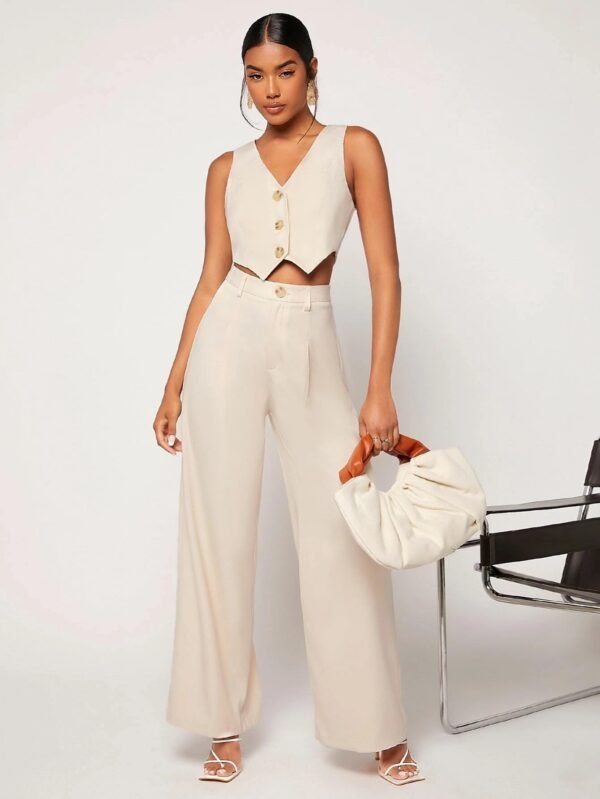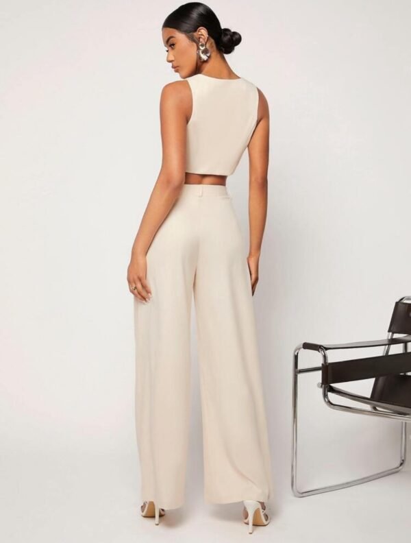 Un look sofisticado y relajado para cualquier ocasión. Este conjunto incluye un chaleco estructurado y un pantalón de corte recto, ambos en un elegante tono beige que combina con todo. Su diseño versátil lo hace ideal para looks casuales o más formales, dependiendo de cómo lo complementes. Perfecto para crear outfits frescos y modernos con un toque de estilo atemporal.